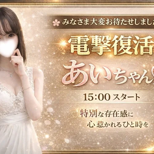 2026.01.15 17:03 1/15🌸木曜🌸✨電撃出勤✨ ✨1千人に一人の逸材✨であると断言します‼️ 💖あいちゃん💖 15:00〜スタートです‼️ ✅まさに“別格”‼️ 完全無欠‼️ 見惚れる”という言葉がぴったりな存在感です。 待ちわびたお客様‼️ 大変お待たせ致しましたm(__)m