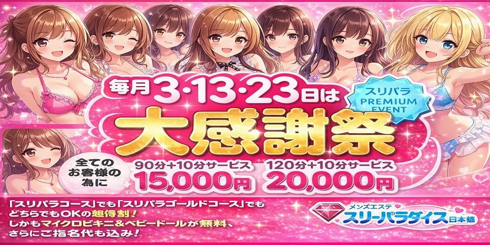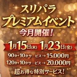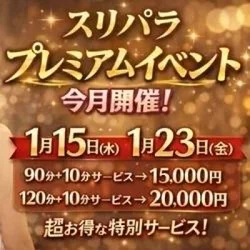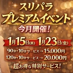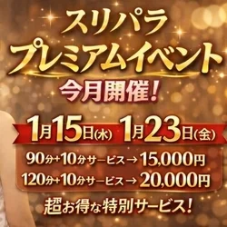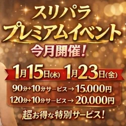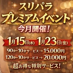 - 【毎月3、13、23日】 大感謝祭‼️~全てのお客様の為に~‼️ ✅️90分+10分サービス⇒15,000円 ✅️120分+10分サービス⇒20,000円 ※『スリパラコース』でも『✨️スリパラゴールドコース✨️』でもどちらでもOKの超得割‼️ ✅️しかも‼️マイクロビキニ&ベビードールが無料です👍 ✅さらに‼️ご指名代も込みで御座います👍